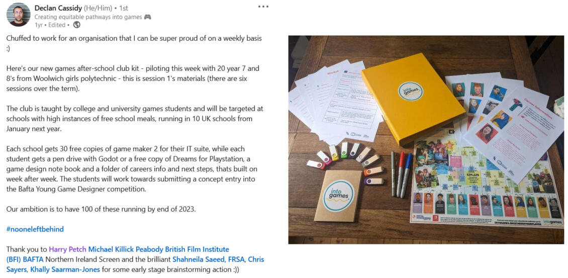 I was a consultant for the planning of the Into Games Club - an after-school pilot scheme to make game development resources accessible to underrepresented young people in the sector.